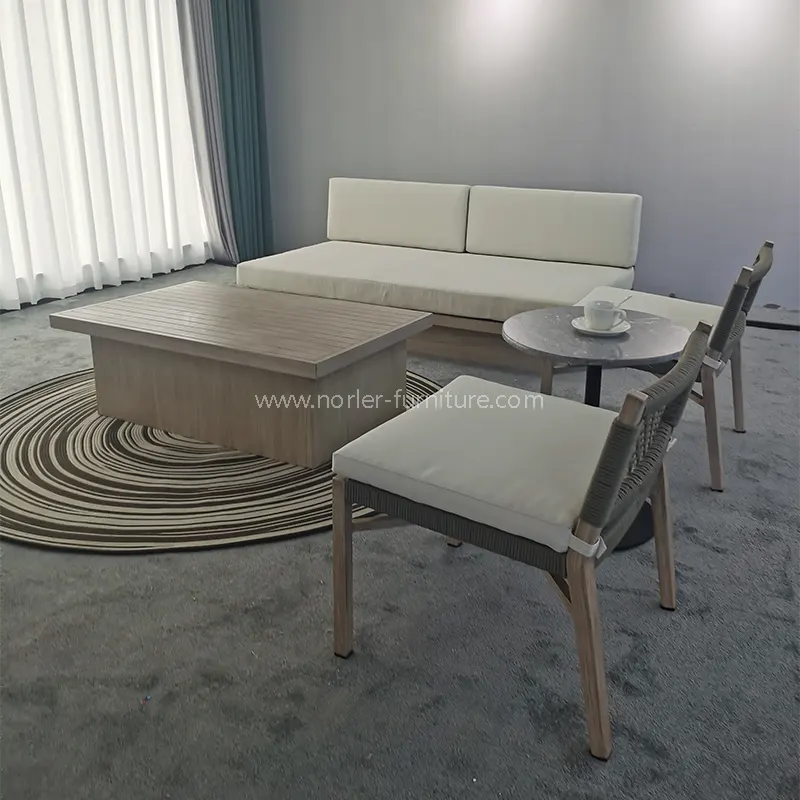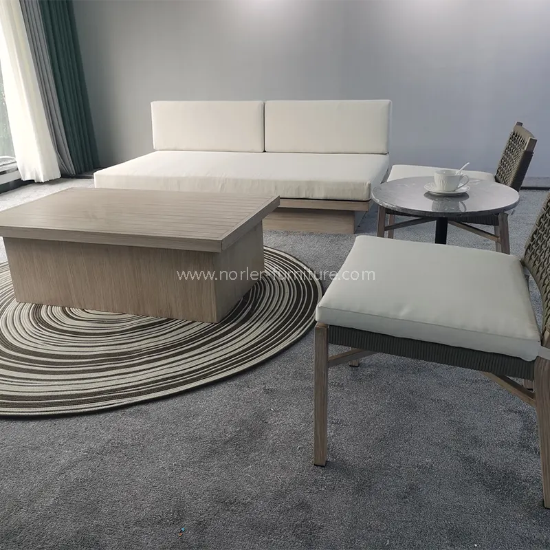 3. Materiał: aluminiowa rama z powłoką w proszku z ziarna drewna, tkanie linowe, wodoodporne na zewnątrz za pomocą poduszki tkaniny