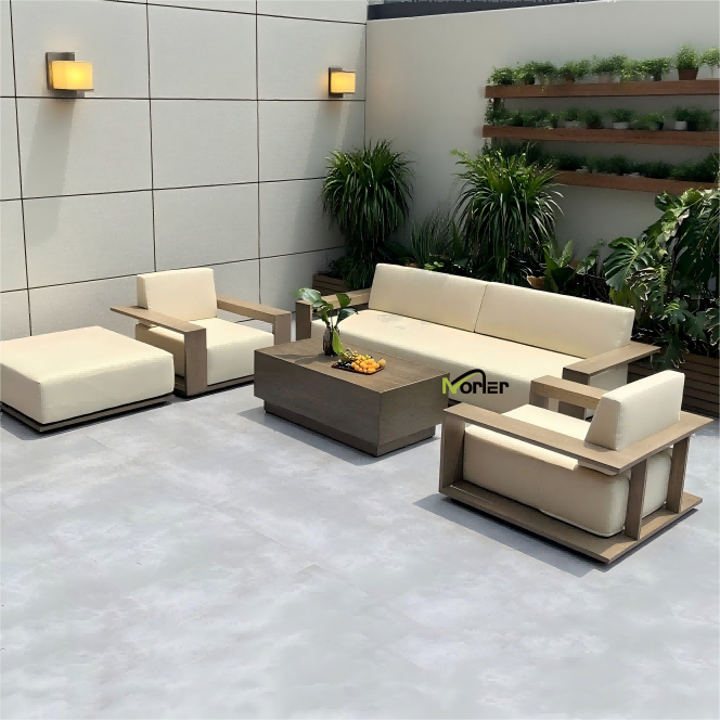 5. Sofa ogrodowa z drewna tekowego: Wykonana z naturalnego drewna tekowego odpornego na warunki atmosferyczne, sofa ta charakteryzuje się drobnym ziarnem, dużą stabilnością i nabiera bardziej luksusowego charakteru w miarę użytkowania, co czyni ją klasycznym wyborem do stworzenia ekskluzywnego balkonu w stylu kurortu.