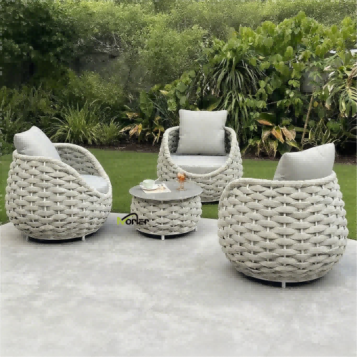 4. Sofa ogrodowa ze sznurkiem: Ręcznie pleciona lina jest wizualnie lekka i oddychająca, a aluminiowa rama dodaje nowoczesnego akcentu. Łącząc wygodę i kunszt, jest popularnym wyborem przy tworzeniu wyrafinowanego balkonu.