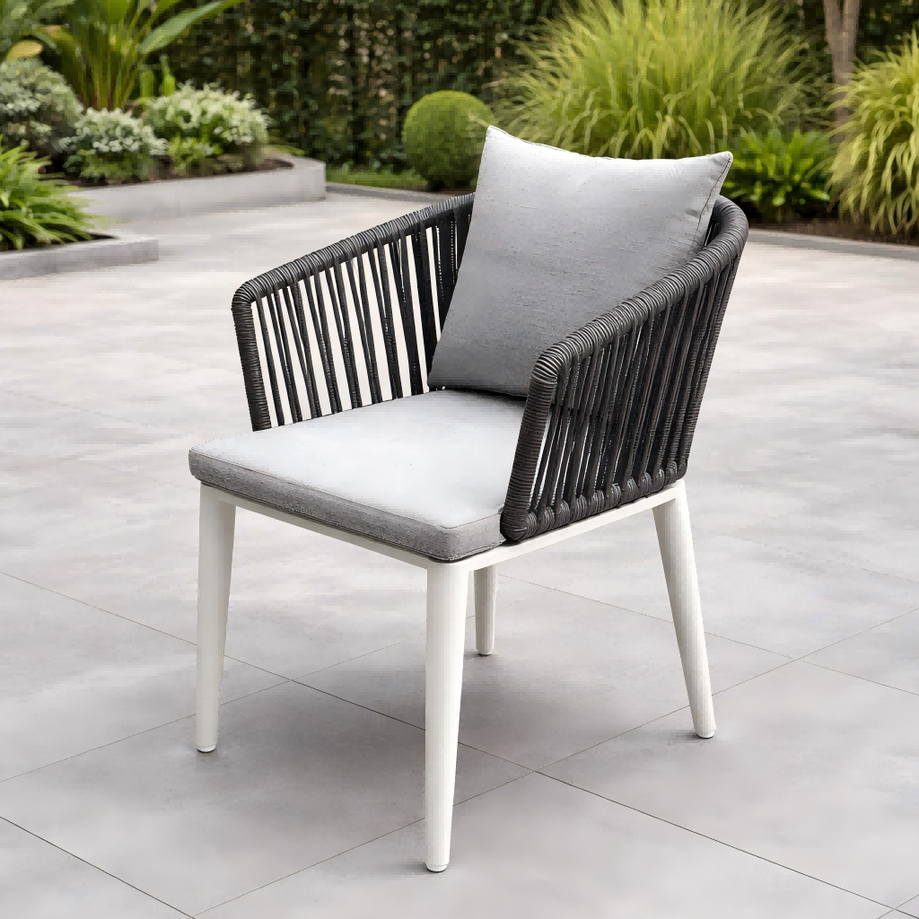Krzesła do jadalni mają oparcie tkane z liny, które nadaje im nowoczesny i elegancki wygląd, a jednocześnie zapewnia wygodne podparcie. Rama wykonana jest z aluminium malowanego proszkowo, co zapewnia doskonałą odporność na rdzę i warunki atmosferyczne.